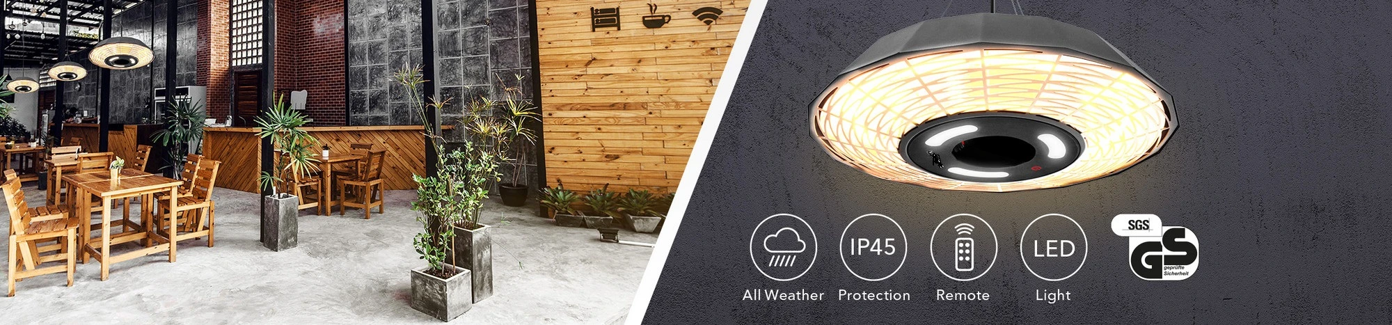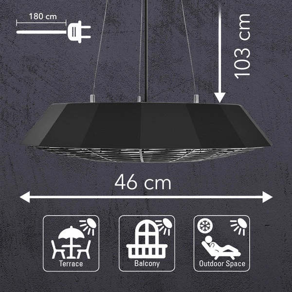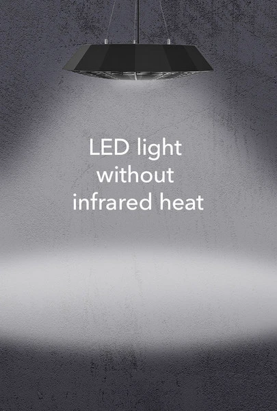 Geometrično oblikovan stropni grelnik z močjo 2000 W IR21 gradi most med izjemnim dizajnom izdelka in dobro premišljeno funkcionalnostjo. Zasnovan za enostavno ogrevanje nepokritih prostorov na prostem, mat črni sevalni grelec v obliki mnogokotnika zagotavlja prostore za sedenje in stojišča v zunanjih restavracijah, balkonih in terasah s hitro in prijetno infrardečo toploto za dobro počutje. Po potrebi je mogoče z daljinskim upravljalnikom vklopiti namizno LED osvetlitev s tremi snopi in tako ustvariti atmosfersko vzdušje s toplo belo svetlobo. Mreža z gosto mrežo ščiti grelno cev pred radovednimi otroškimi prsti in naključnimi dotiki. Optimalni pogoji za občutno prijetnejše preživljanje na prostem in občutno povečanje prodaje gostinskih lokalov v mrzli zimi.