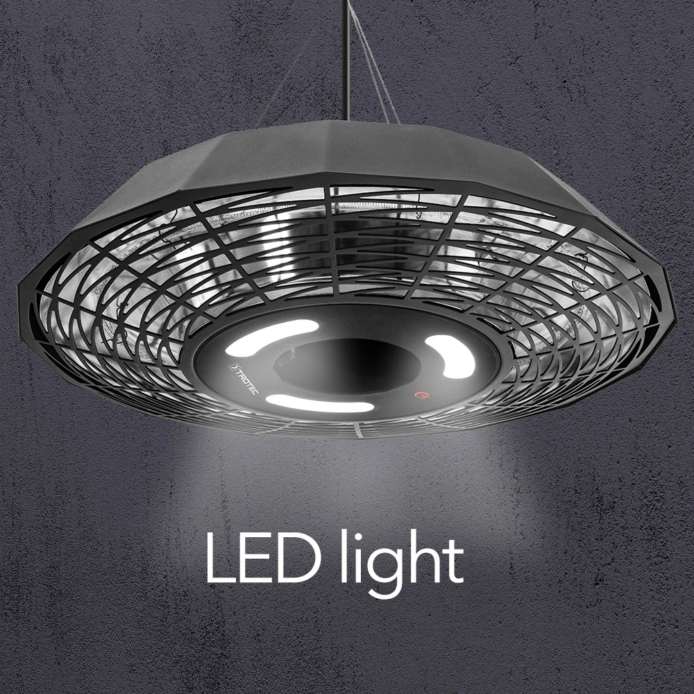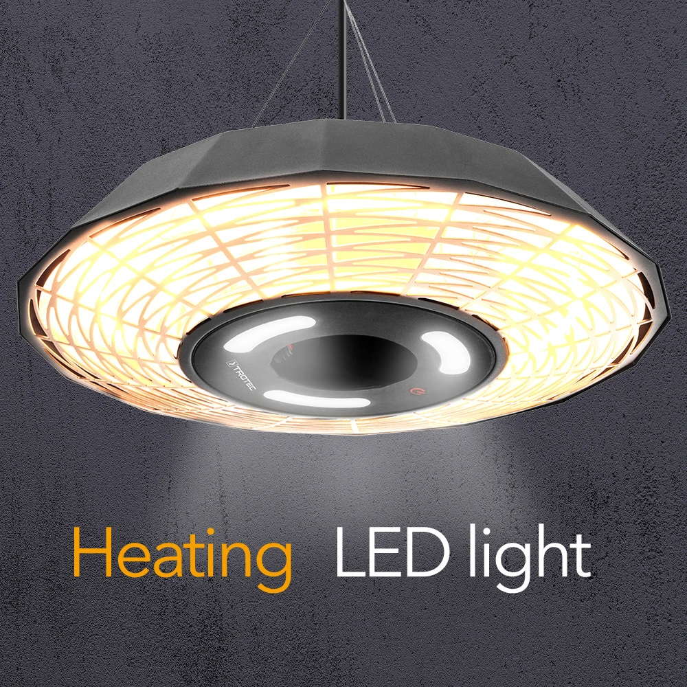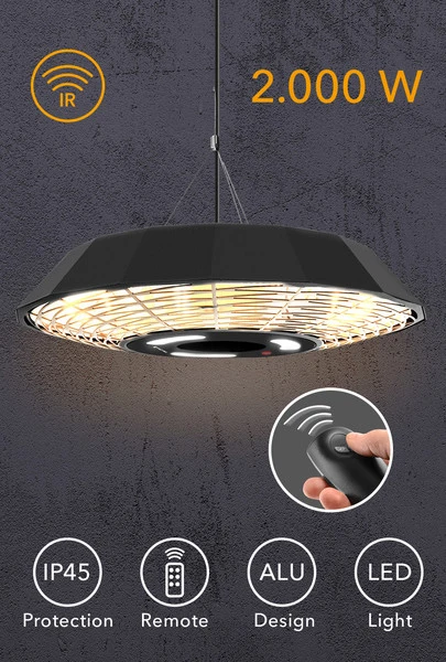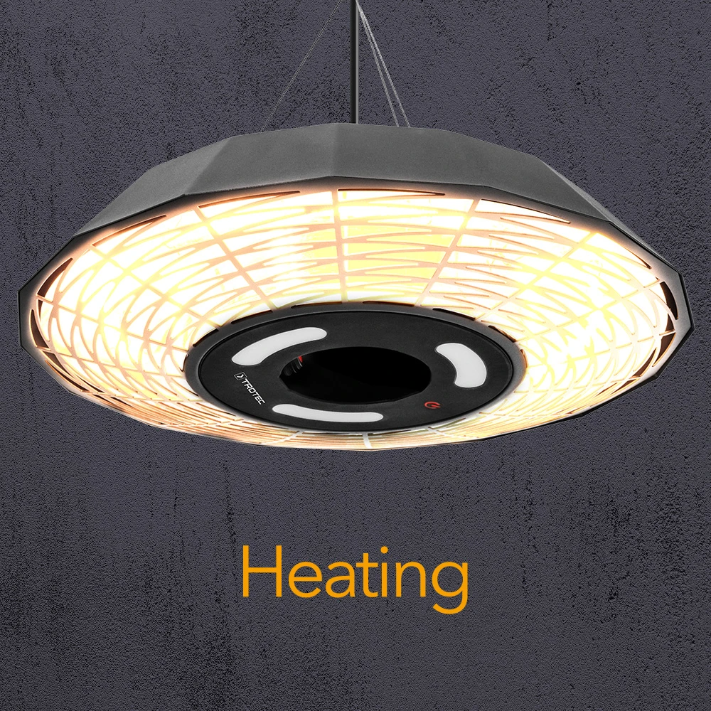 Dizajnerski stropni grelnik z močjo 2.000 W IR21 navdušuje s sodobno poligonalno zasnovo in zagotavlja sorazmerno stroškovno učinkovito 360° vsestransko toploto in toplo LED ambientalno svetlobo. Infrardeča toplota se razvije takoj, ko napravo vklopite s stikalom za vklop/izklop z indikatorsko lučko delovanja. Prijetno vzdušje s hitro segrevanjem in LED-svetlobo na prostem. IR21 to omogoča!