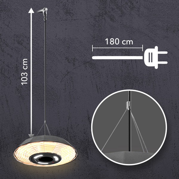 Priložen kabelski sistem omogoča maksimalno prilagodljivost pri namestitvi 3 kg sevalnega grelnika, ki se pritrdi z jeklenimi kabli na dežnik grelnika in stropnega ali stenskega nosilca. Za enostavno montažo grelnika z 1,8 metra dolgim napajalnim kablom in šuko vtičem ni potrebno dodatno vrtanje ali dragi mojstri.